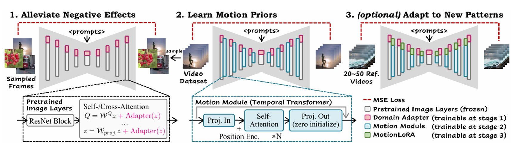 - AnimateDiff는 Domain Adapter, Motion Module, MotionLoRA라는 3개의 모듈로 구성된다.
