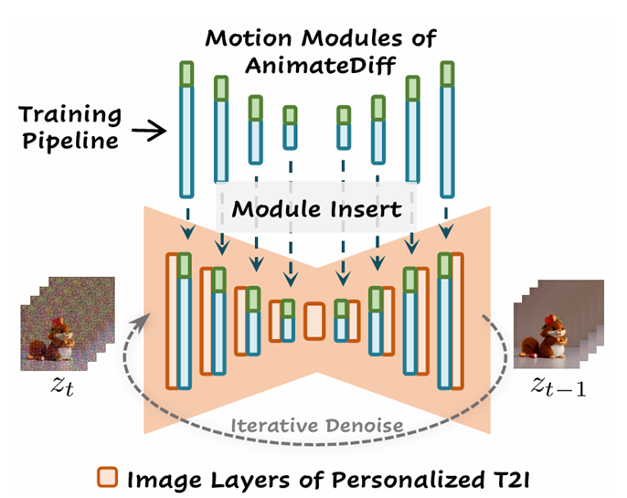 - 즉, 추론 시 학습된 모듈을 기존 T2I 모델에 삽입(plug-in) 하여 애니메이션을 생성한다.