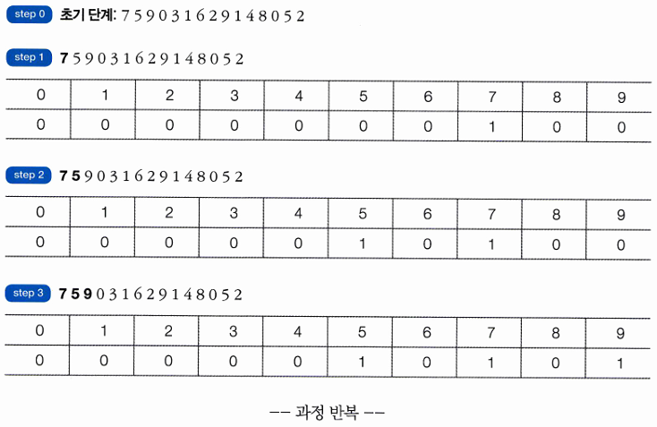- 5 인덱스의 값이 2이므로 '5'는 2번 등장한 것. 이 리스트에 저장된 데이터 자체가 정렬된 형태를 띔
